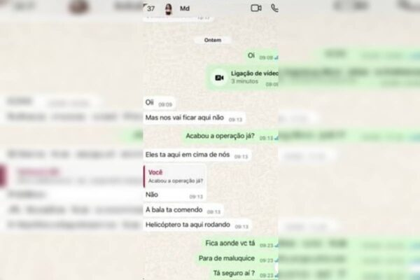 Na conversa pelo WhatsApp, Penélope manda um simples "oi" e faz uma chamada de vídeo que dura cerca de três minutos. Em seguida, escreve: "Oi. Não vamos ficar aqui, não". A amiga pergunta: "Acabou a operação já?". Penélope responde: "Não. Eles tão aqui em cima de nós. A bala tá comendo. Helicóptero tá aqui rodando". Preocupada, a amiga diz: "Fica onde você tá, para de maluquice. Tá seguro aí?".