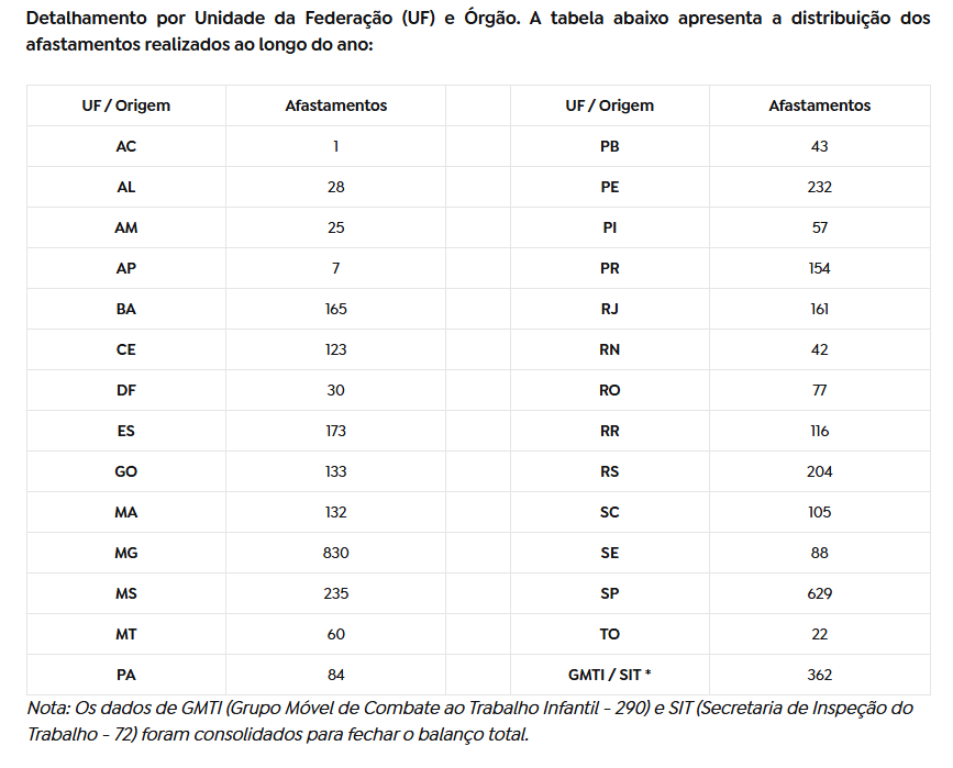 Com base nos dados consolidados de 2025, o estado de Minas Gerais liderou o ranking nacional com o maior número de resgates, totalizando 830 crianças e adolescentes afastados do trabalho infantil, seguido por São Paulo (629) e Mato Grosso do Sul (235). No extremo oposto da lista, os estados que registraram as menores quantidades de afastamentos foram o Acre, com apenas 1 ocorrência, o Amapá (7) e o Tocantins (22).