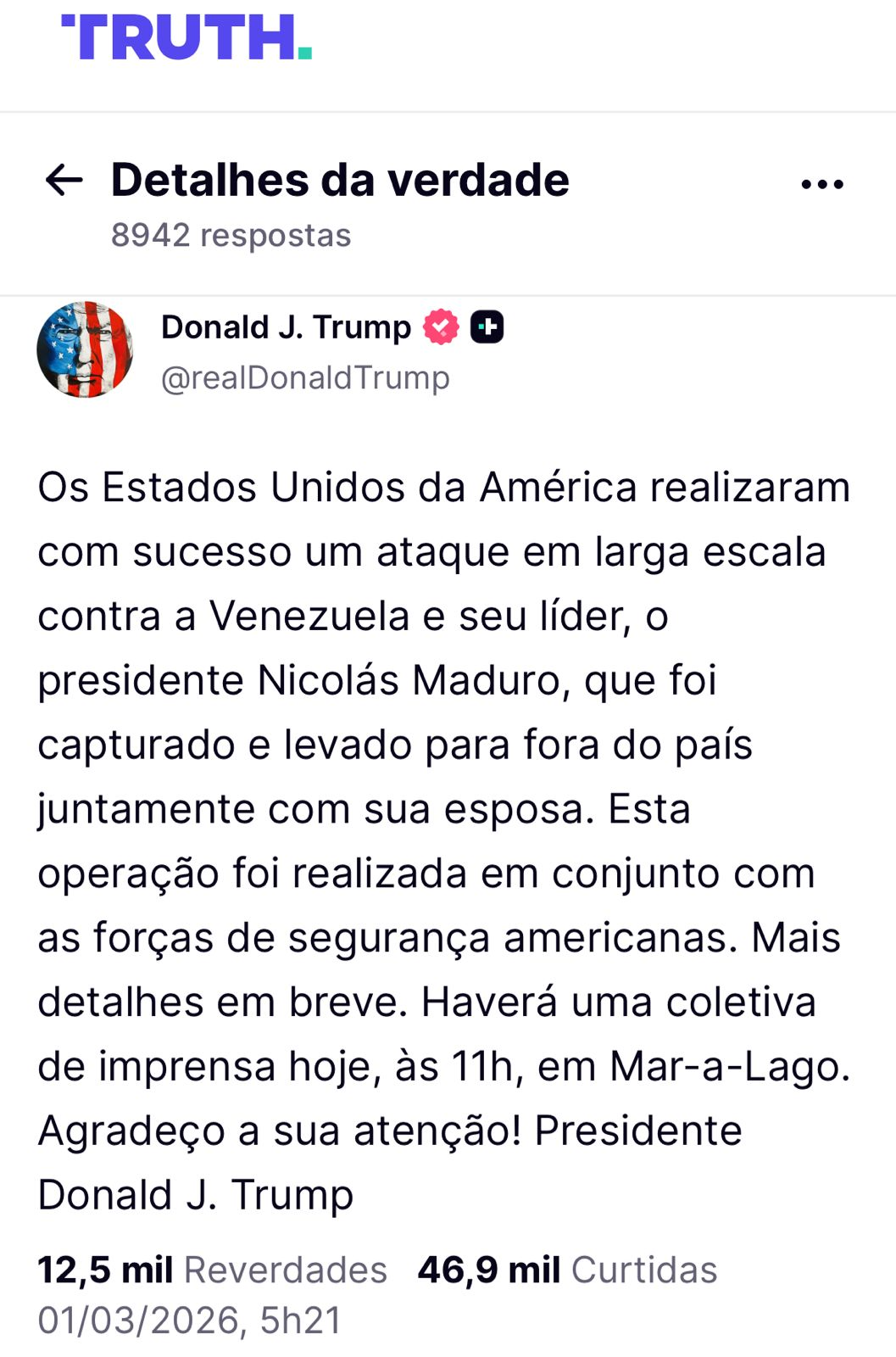 "Os Estados Unidos da América realizaram com sucesso um ataque em larga escala contra a Venezuela e seu líder, o presidente Nicolás Maduro, que foi capturado e levado para fora do país juntamente com sua esposa", disse o presidente norte-americano.