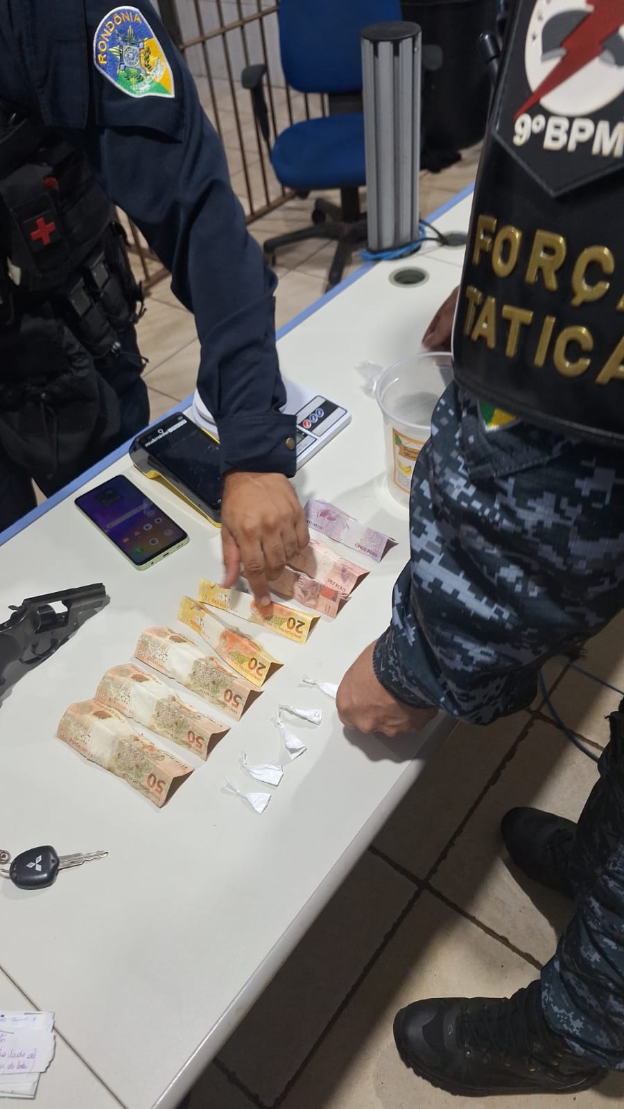 Já na distribuidora, durante a abordagem, os militares constataram que o suspeito portava um revólver calibre 38 com 5 munições intactas, além de 8 porções de cocaína e uma balança de precisão, materiais comumente utilizados em tráfico de drogas. Também foram apreendidos R$ 215,00 reais em dinheiro e uma máquina de cartão.