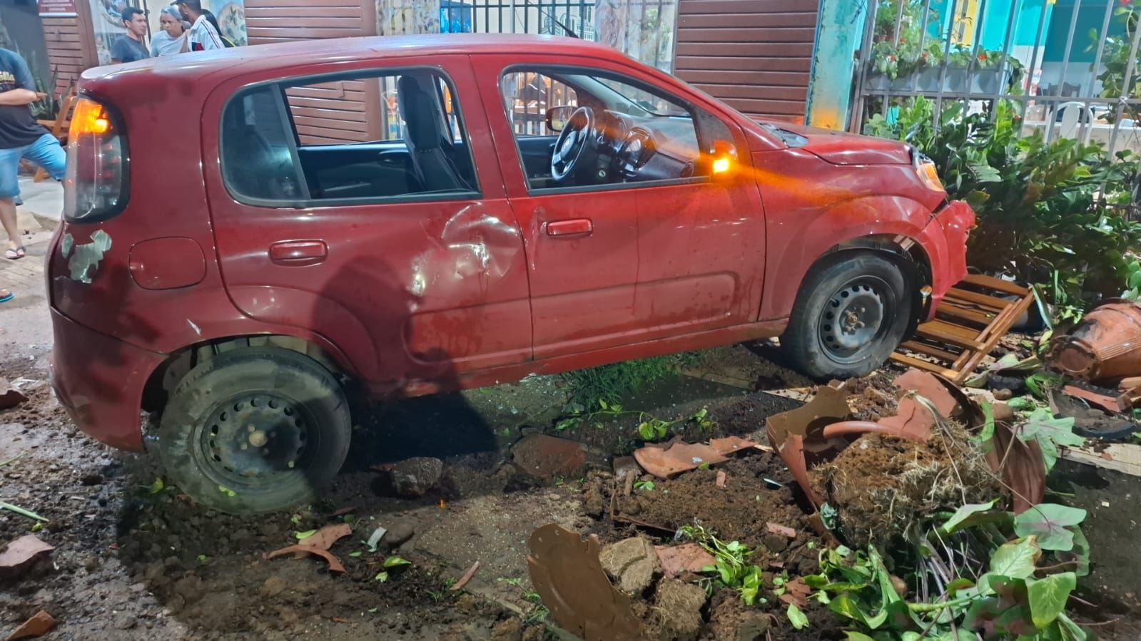 Com o impacto, o carro invadiu a calçada de uma pizzaria e passou ao lado de um restaurante que funciona no mesmo ponto comercial. No momento do acidente, algumas cadeiras estavam dispostas em frente ao estabelecimento.