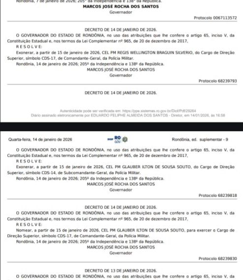 O Governador Marcos Rocha (União Brasil) exonerou o comandante-geral da Polícia Militar Régis Braguin nesta quarta-feira (14) de acordo com publicação no Diário Oficial do Estado (DOE). Braguin exercia o cargo desde julho de 2023, sendo o primeiro soldado da corporação a chegar ao posto de comandante. No lugar de Regis Braguin, quem passa a ocupar o comando da Policia Militar de Rondônia agora é o coronel Glauber Ilton de Souza Neto.