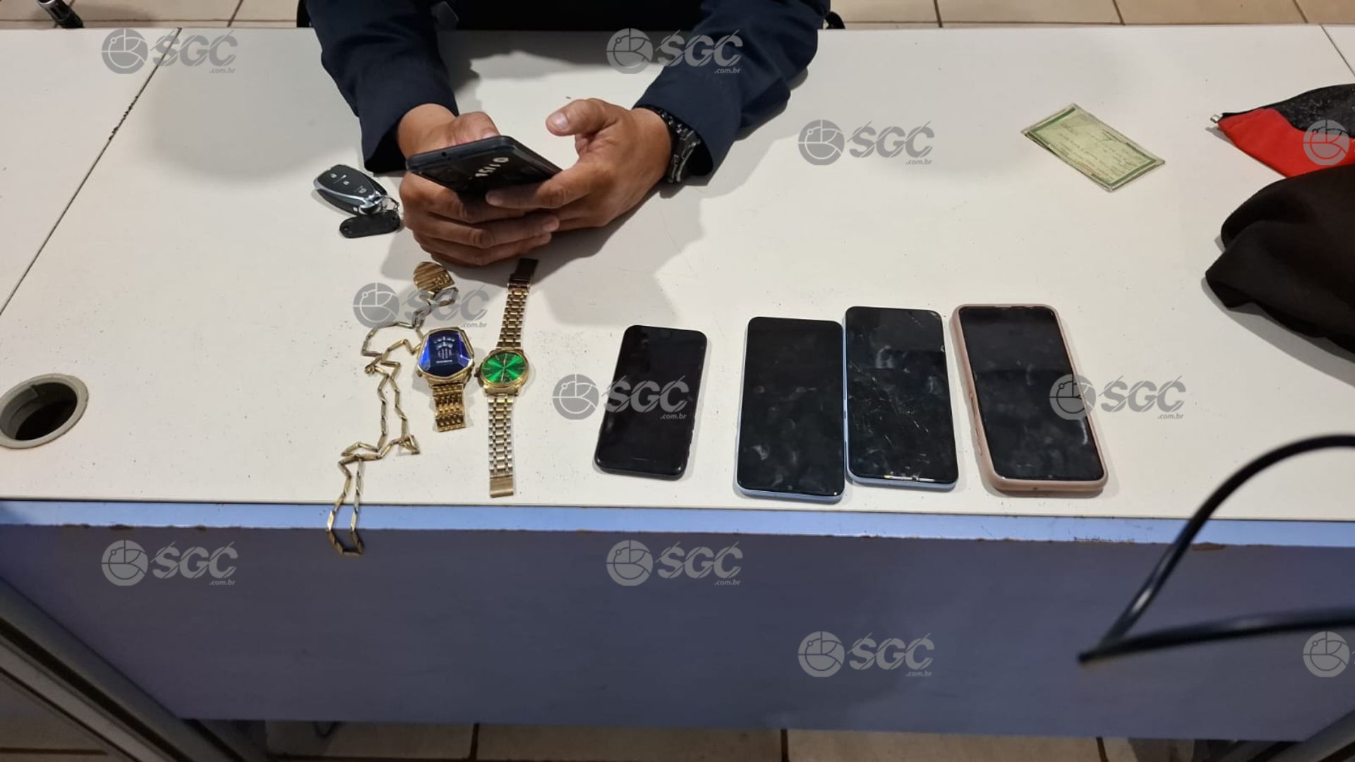 Durante a busca, os policiais encontraram duas jaquetas pretas que correspondiam às descrições dadas pela vítima, uma das quais apresentava barro, corroborando o relato de que a mulher foi derrubada em uma rua de terra. Também foram apreendidos quatro celulares, dois relógios dourados e um cordão, todos sem comprovação de origem.