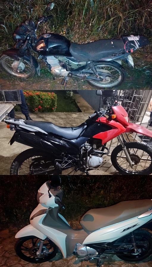 Três motocicletas, produtos de furto, foram recuperadas rapidamente por policiais militares de Ji-Paraná, pouco tempo depois das mesmas terem sido subtraídas do interior de uma imóvel, região do Bairro Green Park, primeiro distrito deste município. Quatro suspeitos ao observarem a aproximação das viaturas, logo, entraram em uma área de mata conseguindo escapar do flagrante.