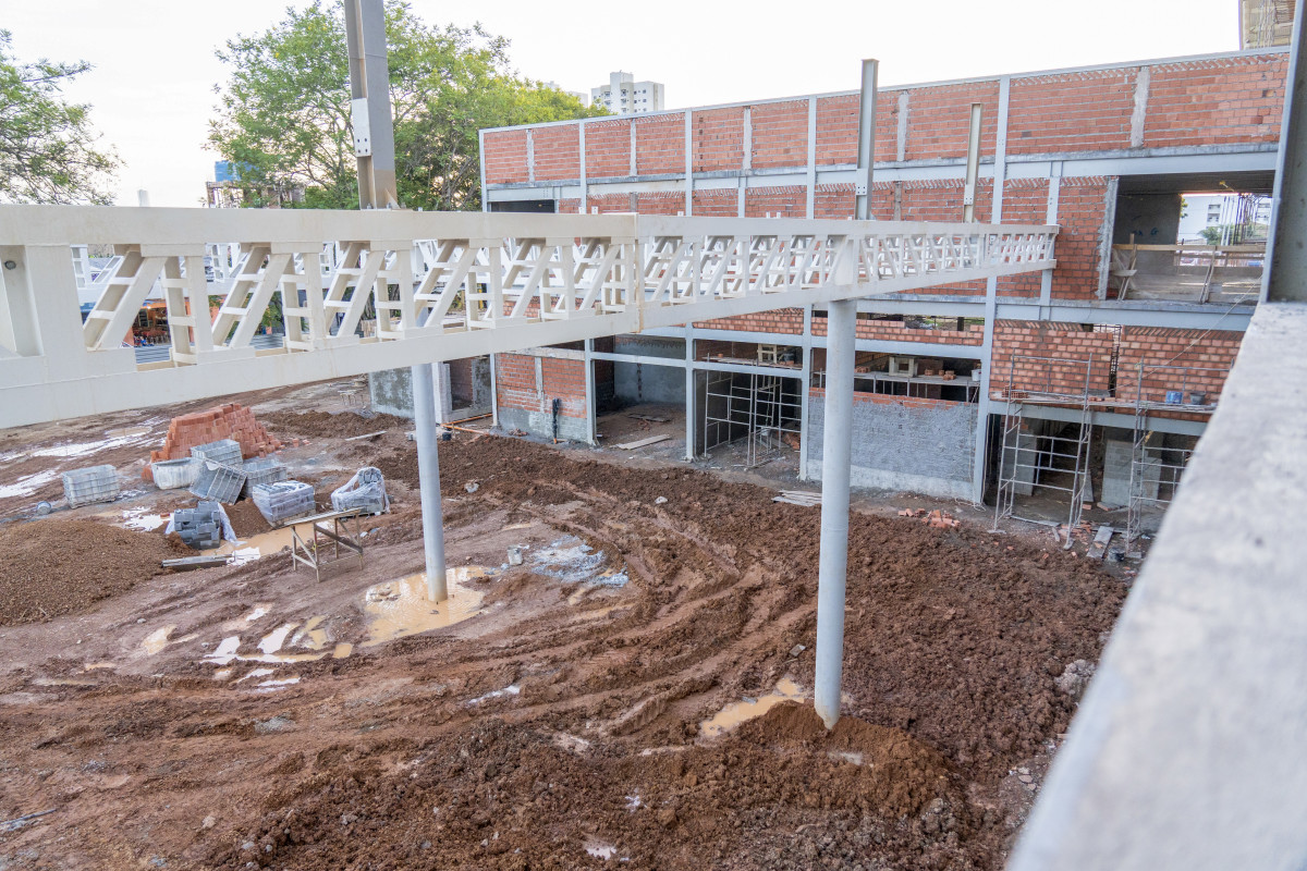 Em janeiro iniciamos o trabalho na parte externa, com arruamento, meio-fio e calçadão", explicou o engenheiro responsável, Marcos Pires, durante a visita do prefeito.