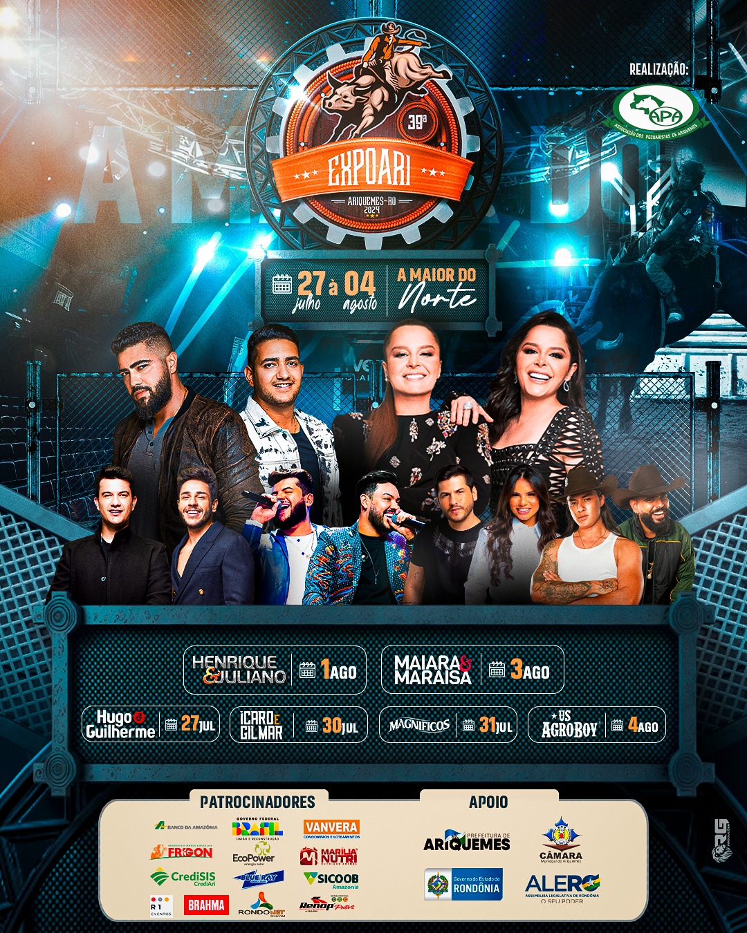 A Expoari terá início neste fim de semana e é considerada a maior festa da região norte. O evento ocorrerá de 27 de julho a 04 de agosto de 2024 e contará com apresentações de renome nacional, incluindo Henrique e Juliano, Maiara e Maraísa e a Banda Magníficos.