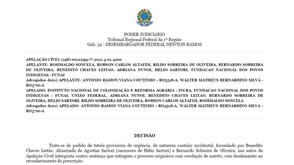 O Tribunal Regional Federal da 1ª Região, por meio de decisão do Desembargador Federal Newton Ramos, concedeu tutela provisória de urgência para suspender os efeitos das notificações de desocupação expedidas pela Fundação Nacional dos Povos Indígenas (FUNAI) contra colonos que ocupam imóveis rurais na região do Parque Nacional dos Pacaás Novos. A medida visa preservar a posse dos requerentes até o julgamento definitivo da apelação cível.