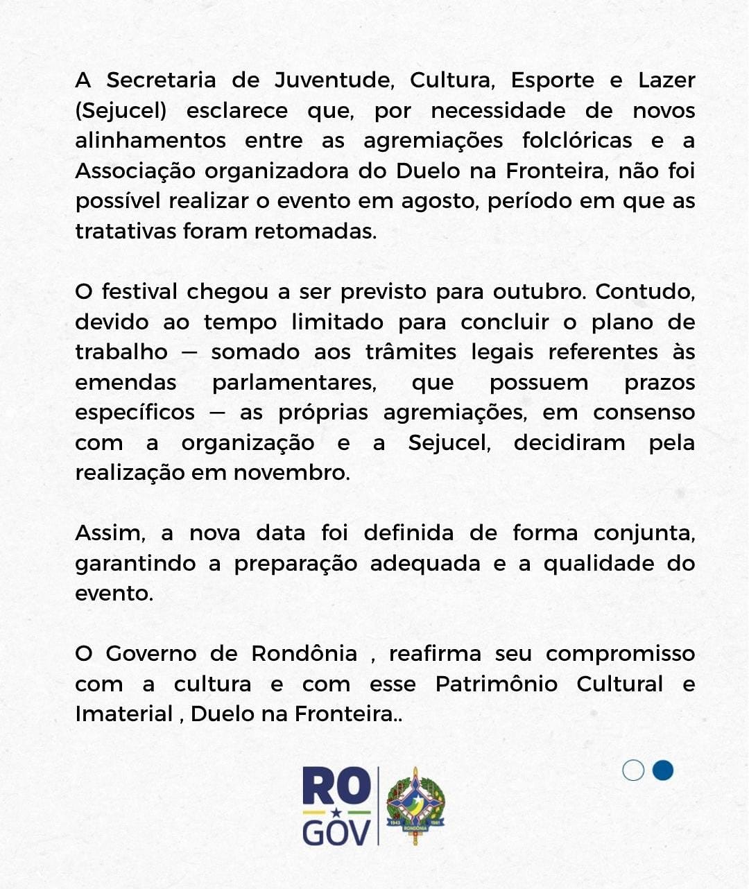 A Secretaria de Juventude, Cultura, Esporte e Lazer (Sejucel) informa que o festival "Duelo na Fronteira" foi adiado de agosto para outubro, mas não ocorreu devido ao tempo limitado para finalizar o plano de trabalho.